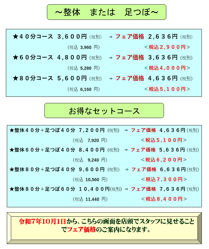 (税抜4,636円) - 足つぼ40+整体60コース(計100分)通常9,240円(税込)→